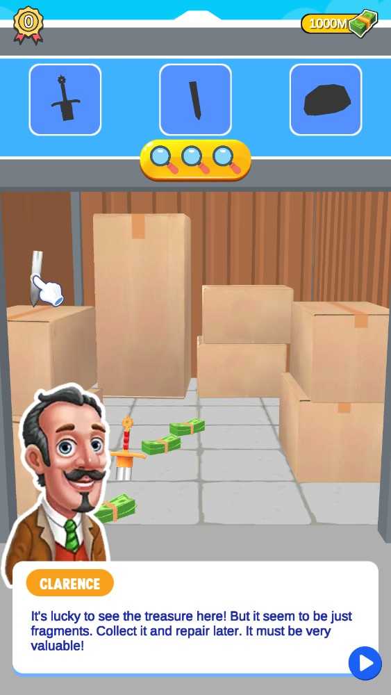 1、尘土清理探索:在仓库中操控工具拨开尘土,通过点击或滑动清除遮挡物,观察环境细节寻找宝藏线索,如墙壁划痕、物品摆放规律,顺着线索定位宝藏位置。