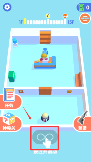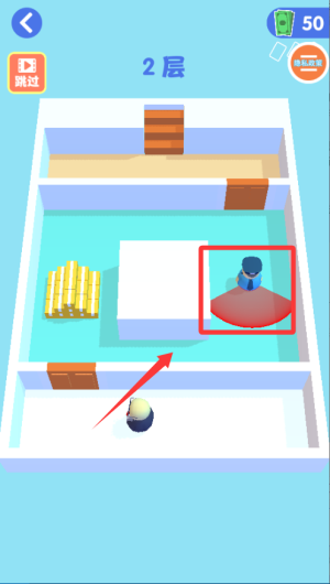 1、核心躲避机制,通过滑动控制角色移动,避开守卫视线范围。被发现时会触发搞笑动画,然后从当前楼层重新开始。