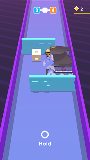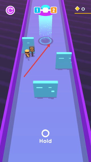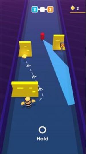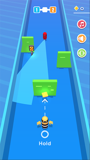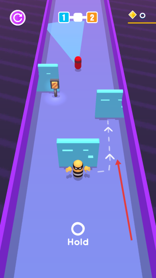 1、长按底部Hold按钮,规划角色移动虚线路径,避开红色敌人、蓝色障碍物,朝着目标方向引导行进。