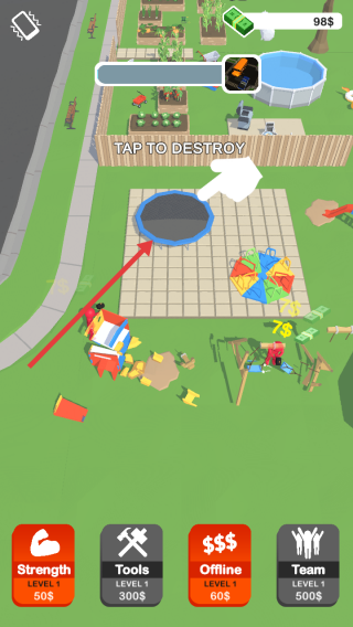 1、进入游戏场景,依据TAP TO DESTROY提示,点击指定物品,触发破坏流程,成功破坏后可获取金钱。