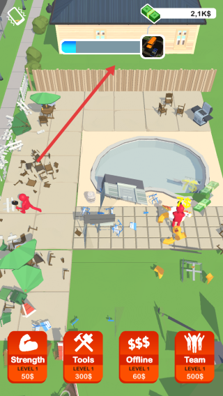 3、不断破坏场景内物品家具、建筑等积累金钱,利用金钱升级下方功能,提升破坏效率与收益,推进关卡进程。