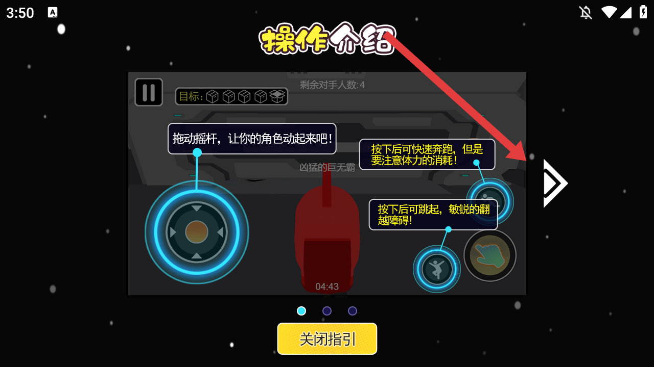 1、熟悉游戏操作,拖动摇杆移动角色,按奔跑键加速,要留意体力,点击跳跃键翻越障碍。