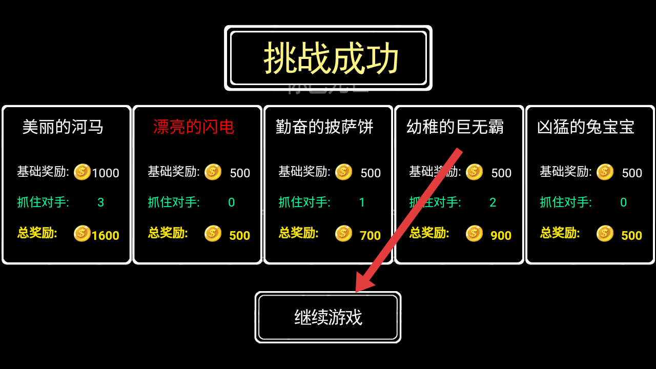 3、出现挑战结算界面,成功通关后,点击继续游戏按钮,开启下一轮挑战,领取本轮奖励。