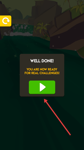 3、完成教学后,点击WELL DONE!弹窗的绿色播放按钮,进入正式挑战关卡,体验河道冒险。