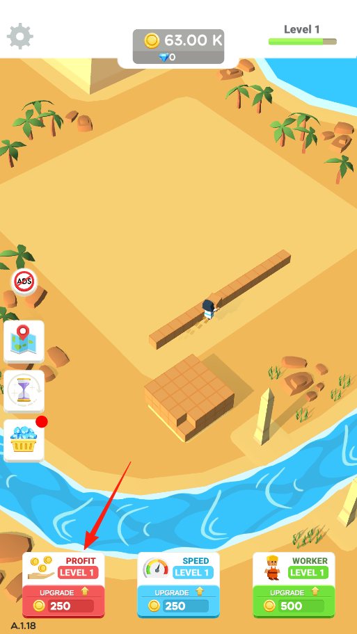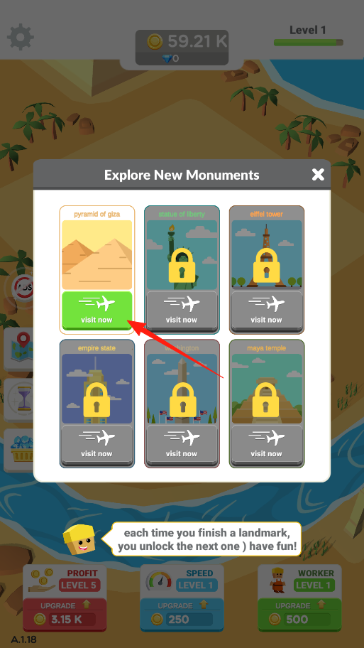 1、进入空闲地标大亨关卡1,点击PROFIT升级按钮消耗金币提升收益等级,通过升级增加每轮收益,助力更快积累资源,体验基础养成机制。