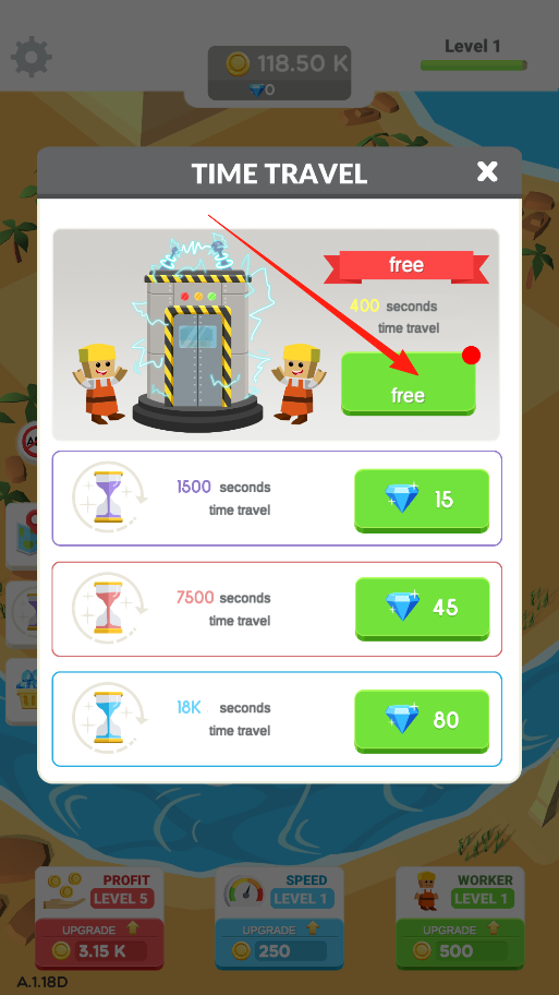 3、在TIME TRAVEL界面点击free按钮,触发免费时间旅行,通过此操作获得时间加速,加快资源获取与建筑进度,体验时间旅行机制。