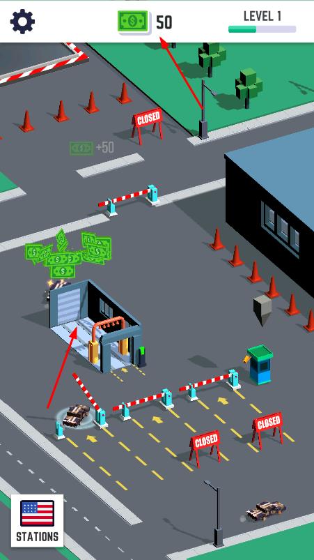 1、在初始关卡场景中,可看到洗车设施,通过完成洗车订单来赚取金钱,屏幕上方会显示当前拥有的金钱数量。