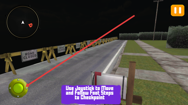 1、进入游戏后,利用左下角绿色摇杆移动角色,沿着路面,跟随脚印前往,注意避开道路封闭障碍。