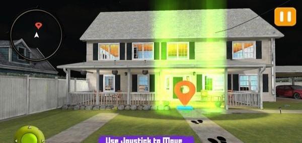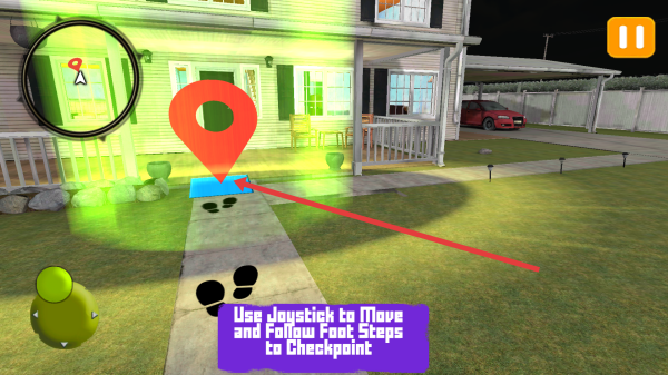 2、到达房屋区域,还是通过绿色摇杆移动,沿着带脚印的路径,朝着房屋门口的蓝色checkpoint前进。
