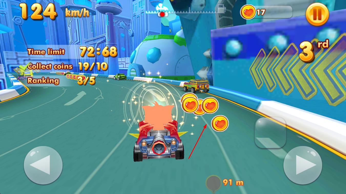 2、比赛中通过方向键控制卡丁车转向,利用加速道具提升速度,超越其他动物对手,保持领先位置。