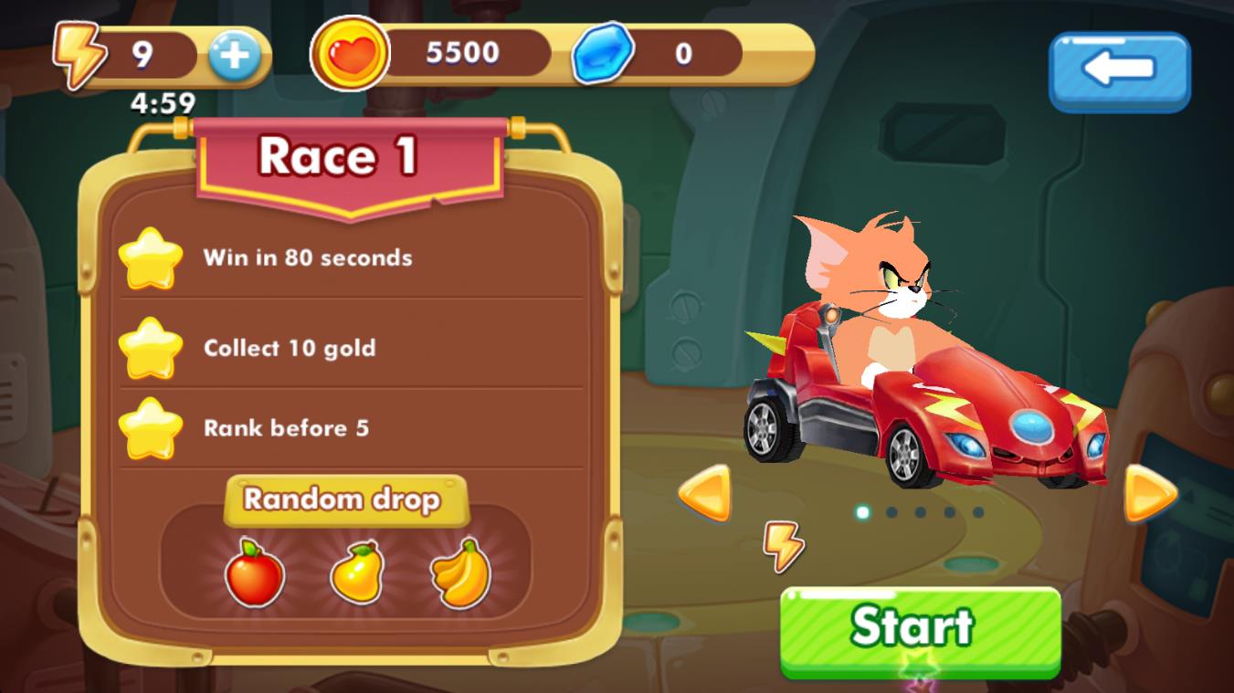 1、卡通角色设计:以猫汤姆为主的动物角色造型呆萌可爱,搭配鲜明的色彩风格,赋予赛车竞速轻松欢快的氛围,吸引玩家目光。