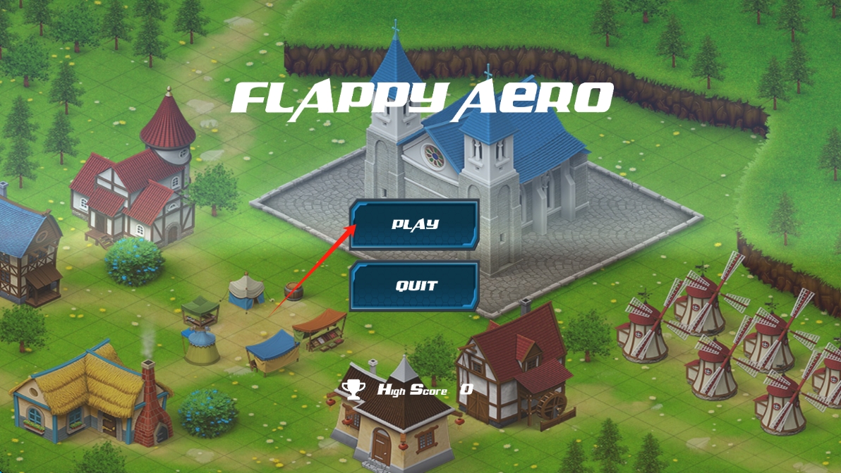 1、在Flappy-Aero游戏启动界面,跟随箭头提示,点击PLAY,开启Flappy-Aero冒险,进入游戏世界。