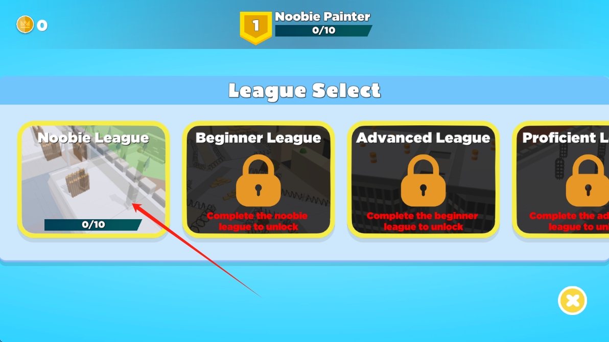 2、进入游戏联赛选择界面后,根据箭头提示,选择NoobieLeague,开启初级联赛挑战。