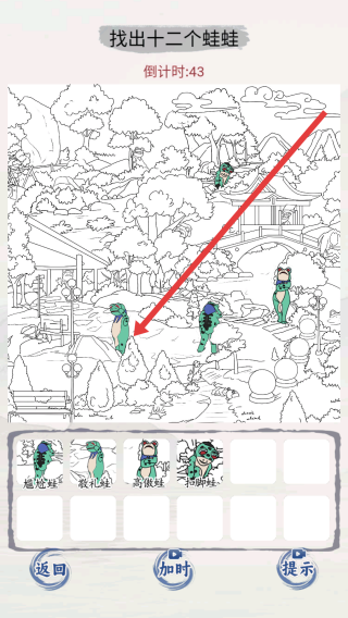 1、进入找出十二个娃娃关卡,先聚焦已标识区域,点击箭头指向的绿色恐龙装扮娃娃,开局优先锁定明确目标。