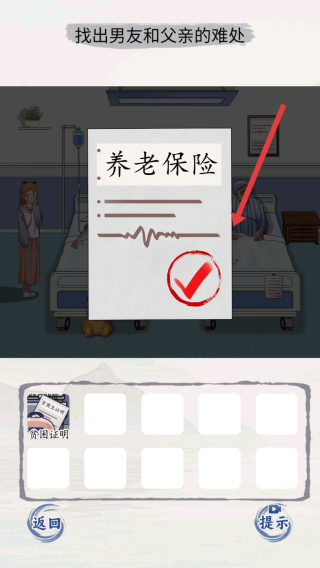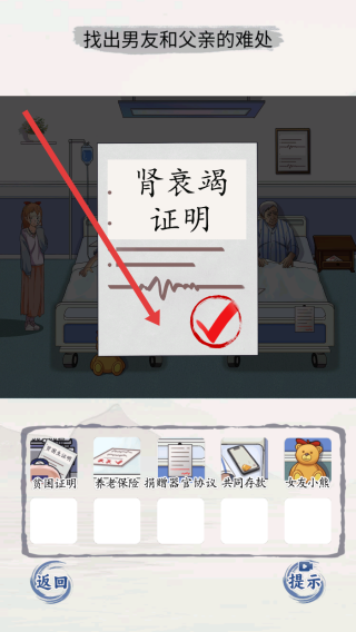 3、切换场景,关注箭头指向的肾衰竭证明,明确父亲健康困境,结合图鉴已有贫困证明,梳理难题线索。