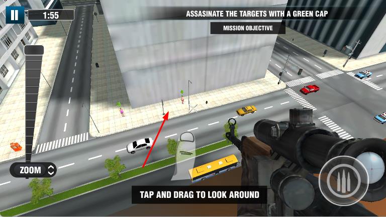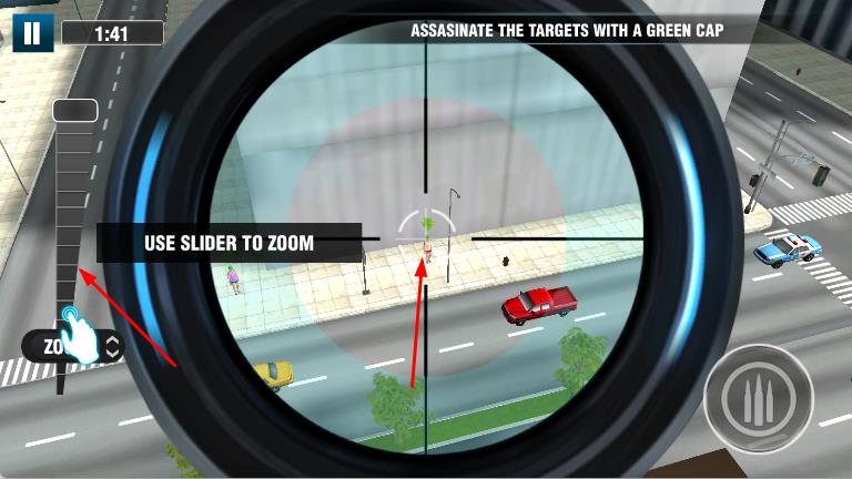 2、通过点击并拖动屏幕来环顾四周,寻找目标,点击左侧旁边的滑块,调整狙击镜的放大倍数,精确瞄准目标。