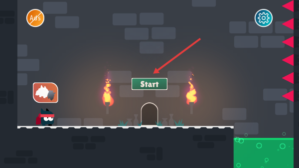 1、角色身处初始场景,两侧火炬映照绿色Start标识,点击该标识,便能进入关卡选择界面开启冒险流程。