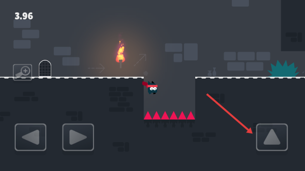 3、行进时遇悬崖尖刺陷阱,瞅准时机点击右侧跳跃按钮,操控角色跃过尖刺,持续推进关卡进程。