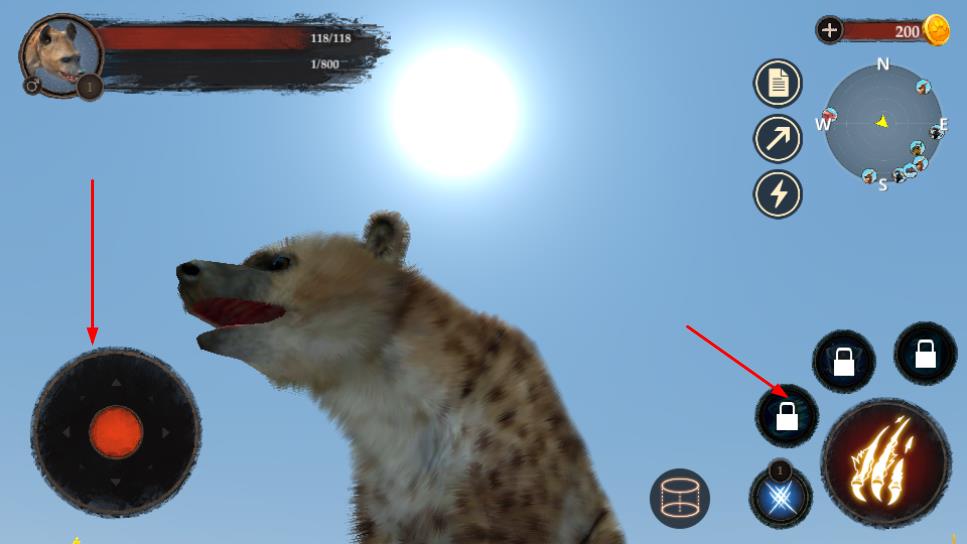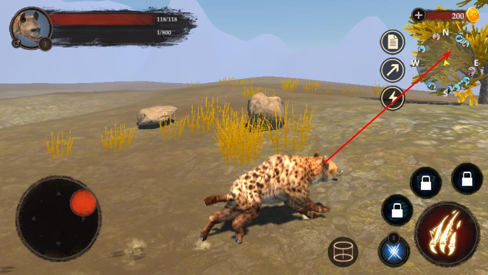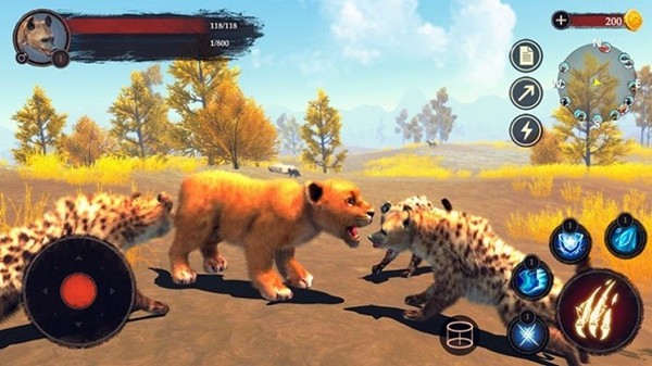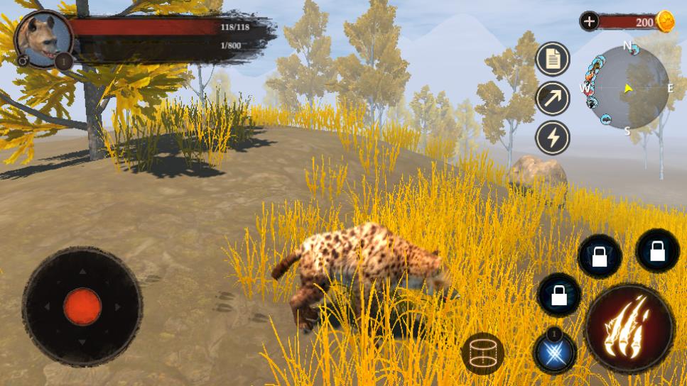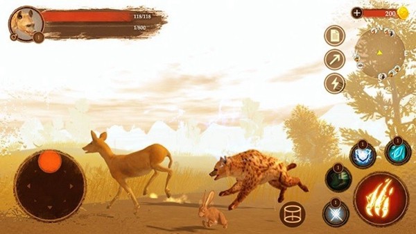 2、通过左侧摇杆控制鬣狗移动,右侧解锁技能如火焰攻击,狩猎场景内猎物如猎豹,获取资源。