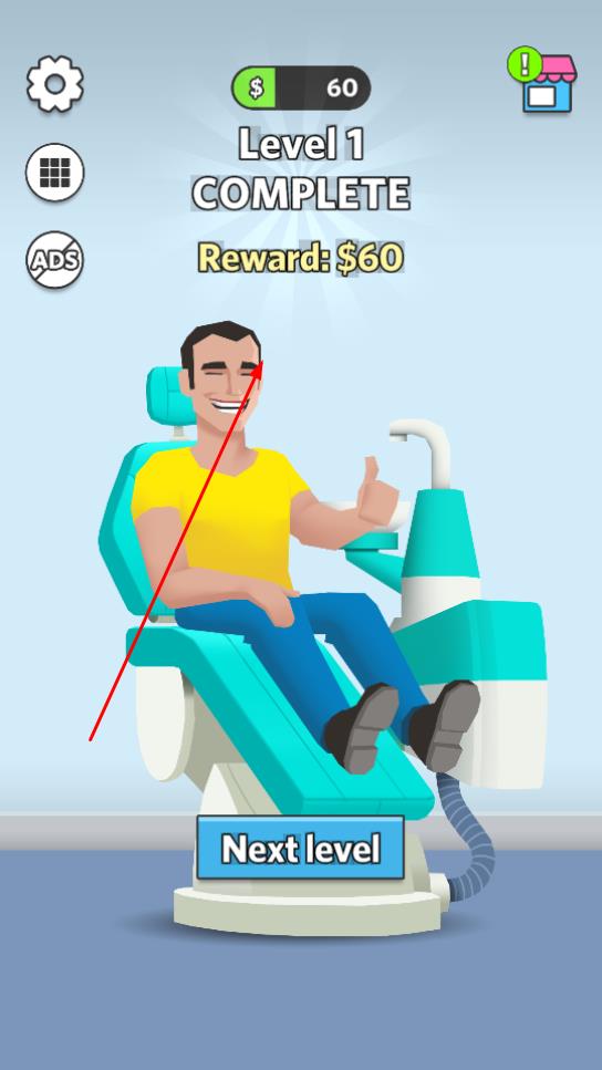 3、完成牙齿清洁后,界面显示Level 1 COMPLETE,获取$60奖励,点击Next level开启下一关。