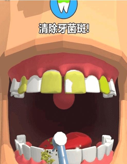 1、进入关卡,面对患者带有黄、绿色污渍的牙齿,使用工具清理牙渍,恢复牙齿洁净状态。