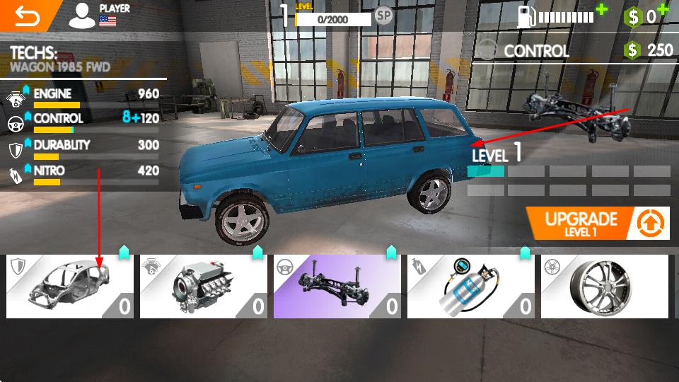 1、在车库界面,选定WAGON1985FWD车型,点击车架、引擎等部件图标,消耗资源升级,提升ENGINE、CONTROL等属性,强化车辆性能。