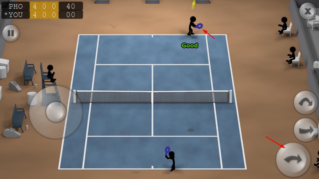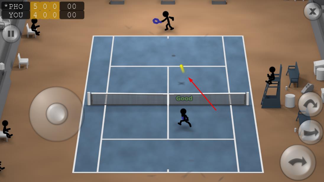 1、灵活移动站位:通过虚拟摇杆控制火柴人在赛场移动,根据对手击球方向提前调整站位,确保能在最佳位置接应来球,为击球创造条件。