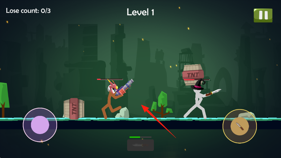 1、操控持枪火柴人,按箭头指引,攻击持剑敌人,注意场景中TNT桶、木箱,利用武器射击,避免被近战攻击。