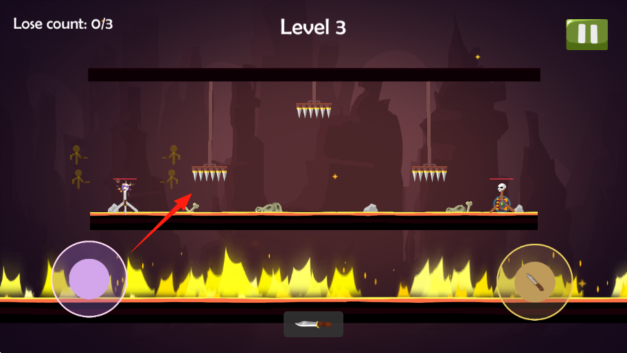 3、在火焰场景,按箭头提示,避开悬挂尖刺陷阱,攻击骷髅敌人,利用左侧摇杆移动,右侧按钮攻击,完成挑战,通关Level3。