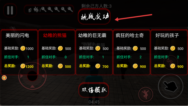 3、完成关卡后显示挑战成功,可查看幼稚的熊猫等角色奖励,点击领取或双倍获取金币,推进游戏进度。