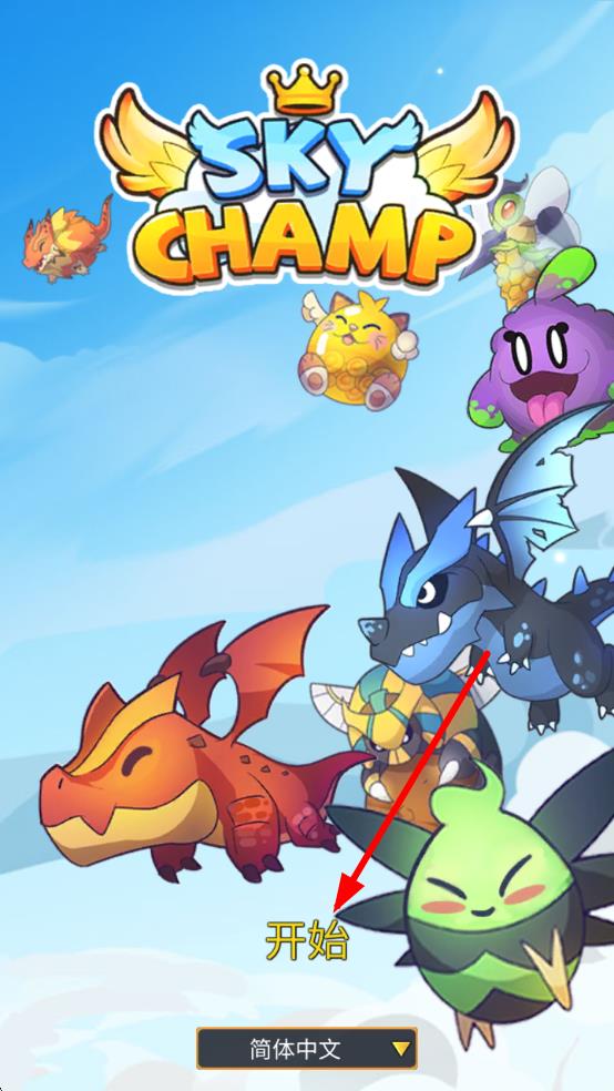 1、进入Sky Champ界面后,找到箭头所指向的开始按钮并点击,正式踏入充满奇幻生物与挑战的冒险旅程。