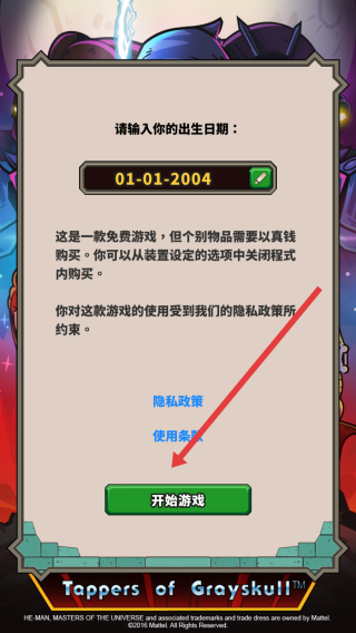 1、在出生日期输入界面,选择好确认日期后点击开始游戏,进入Tappers-of-Grayskull游戏剧情。