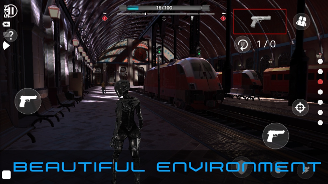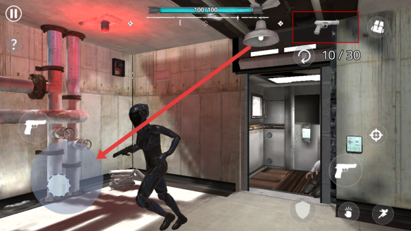 3、进入战斗场景后,滑动左侧虚拟摇杆控制角色移动,点击右侧武器射击,对抗敌人推进关卡。