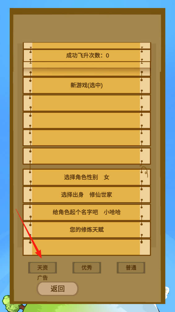 2、进入角色详细设定界面,点击天资优秀普通选择修炼天赋,不同天赋影响修仙进程,选定后完善角色出身名字等信息,推进角色创建,体验天赋抉择玩法。