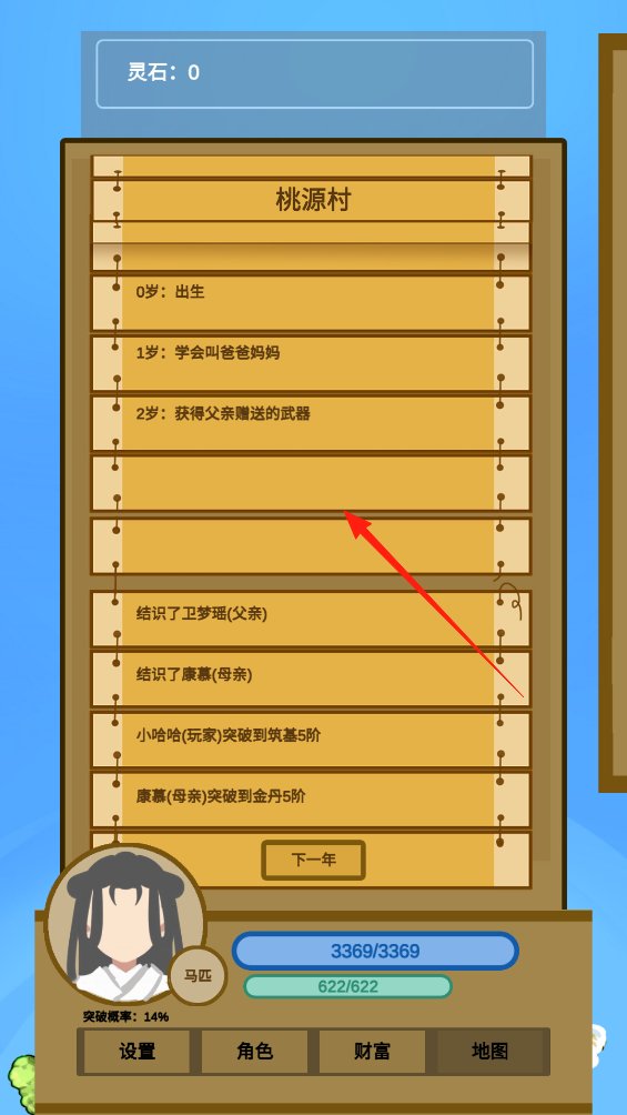 3、在桃源村成长界面,查看角色每年经历,点击空白条目了解成长事件,或通过下一年推进时间,解锁新经历体验角色养成与故事推进机制。