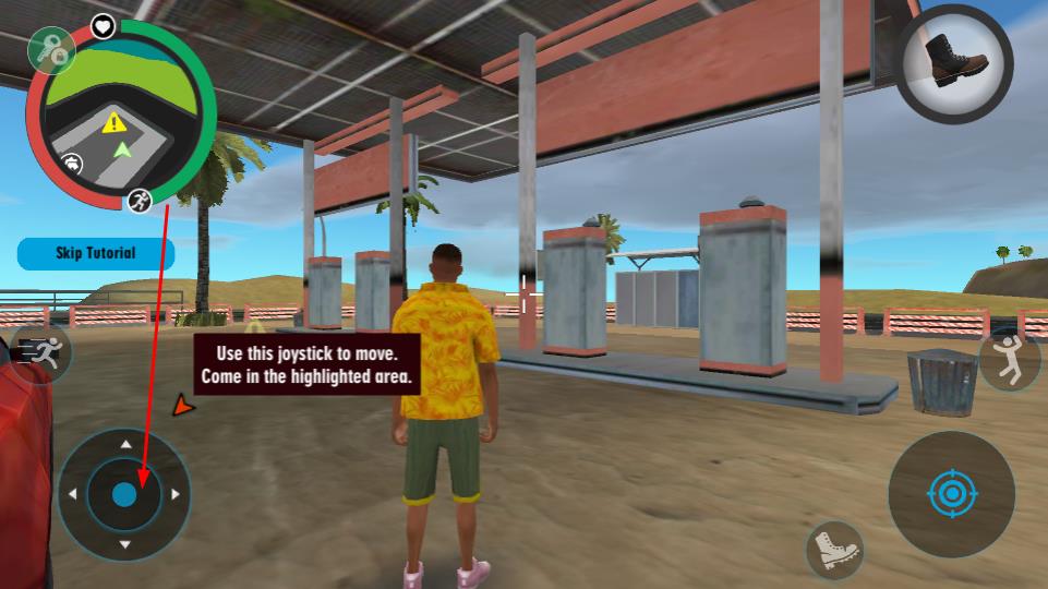 1、操控左下角虚拟摇杆移动角色,跟随指引进入高亮区域,完成初始引导环节,熟悉移动操作逻辑。