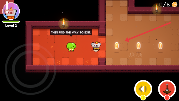 2、Level2按THEN FIND THE WAY TO EXIT提示,引导角色移动收集5枚金币,避开场景障碍,完成收集目标。