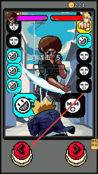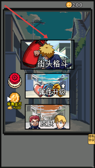 1、主界面选街头格斗选项,点击进入像素风格对战场景,操控角色直面敌人,正式开启格斗挑战。