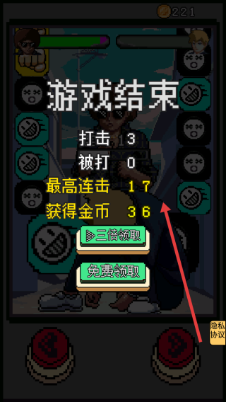 3、战斗结束弹出结算界面,查看打击、连击等数据,点击免费领取获取金币,用于属性升级或皮肤解锁,强化角色继续挑战。