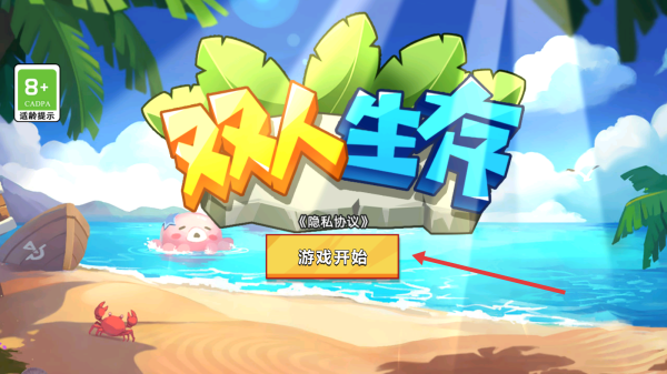 1、进入双人生存海滩启动页,点击中间游戏开始按钮,开启双人合作的生存冒险流程。