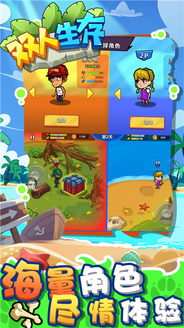 - 双人生存是一款聚焦双人协作的荒岛求生冒险作品,玩家可邀请好友联机踏入资源丰饶的荒岛,从海滩拾贝到密林伐木,从锻造石斧到搭建庇护所,全程需分工配合