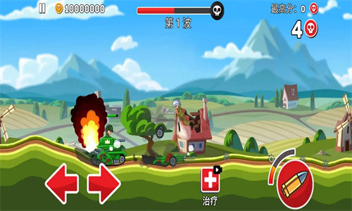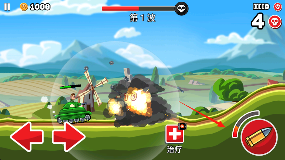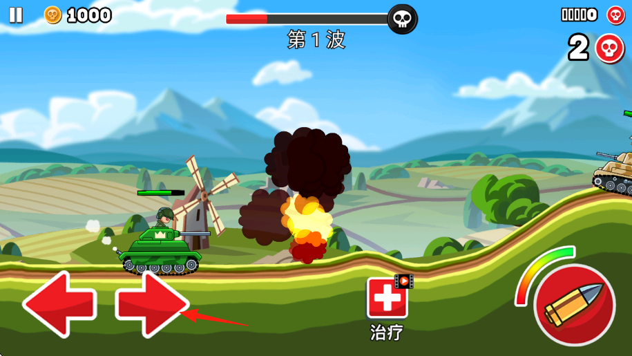 3、角色坦克、士兵血量低时,点治疗回复,抵御第1波攻势,消灭所有敌人,推进关卡,积累金币,解锁新装备。