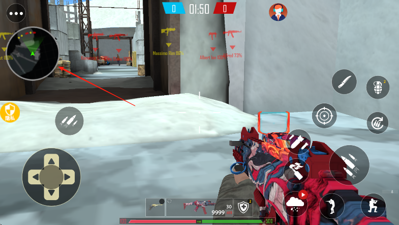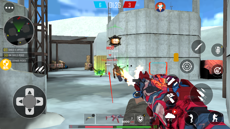 3、拾取场景道具护盾、手雷,按箭头标记追击残血敌人,配合队友如Massimo,Albert,推进战线,赢取对局胜利。