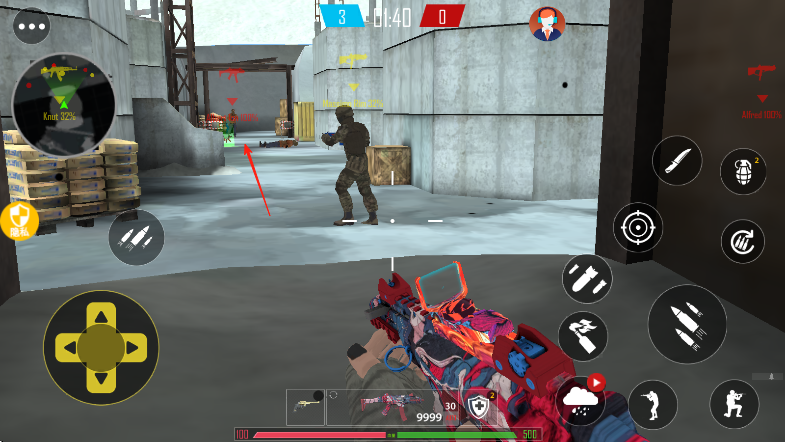 2、遇敌方角色迷彩服、火焰特效,点击右侧射击键,利用掩体箱子、墙壁,切换武器刀、手雷,应对不同战况。