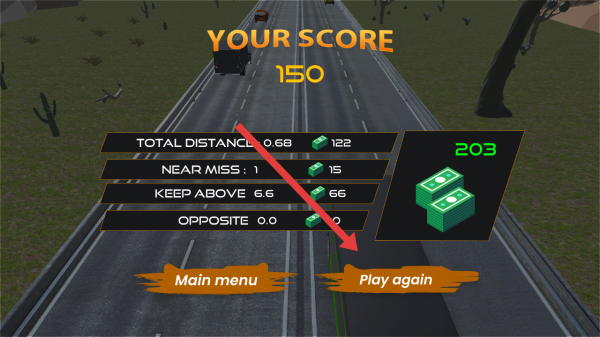 3、结算界面点击Play again,可以立即重启游戏,再次尝试突破游戏分数与行驶距离记录。