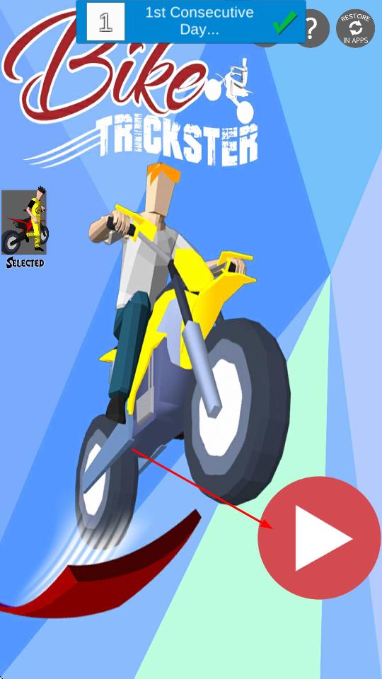 1、点击主界面红色播放按钮,选定黄色摩托与角色,即可进入赛道开启特技骑行挑战,投身充满障碍的骑行冒险。