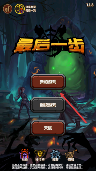 1、在游戏主界面,按箭头指示处,点击选择新的游戏选项,开启全新冒险旅程,进入未知地图探索。