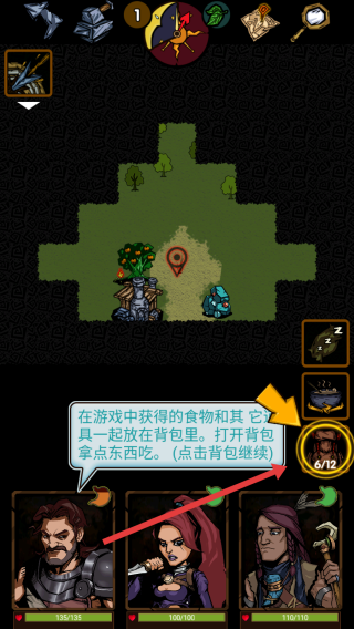 2、在游戏中按提示点击背包,可以通过打开背包界面,查看获得的食物与工具,为冒险做准备。