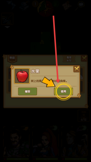 3、在物品栏找到水果,按照提示点击使用按钮,食用水果提升角色饱腹度,维持冒险状态。