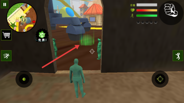 2、游戏内跟随箭头指引,靠近目标区域,绿色互动点,完成任务交互,推进玩具兵生存流程。
